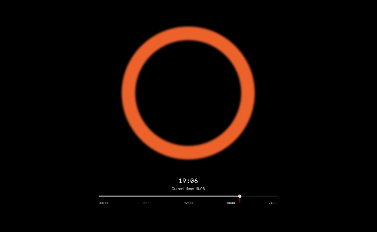 The next experiment builds on the concept of solar eclipse. As time passes during the day the shadow grows larger. The sun goes from light yellow at noon into a dark red as the day comes to an end. The timeline lets you explore the different stages of visualization. In the evening, the sun dies only to be reborn again the following dawn. Time represented by two circles in an endless a cycle.
